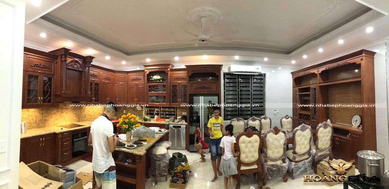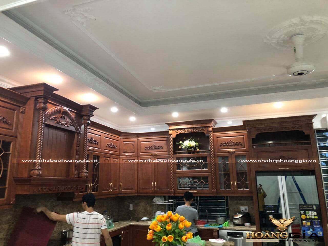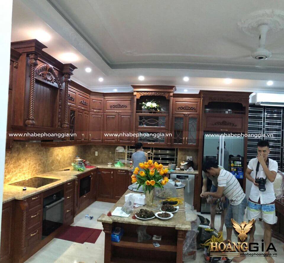 Và để đáp ứng được mong muốn của chị, Nhà Bếp Hoàng Gia đã không ngừng cố gắng mang đến cho chị một mẫu tủ bếp tân cổ điển gỗ gõ đỏ tự nhiên phù hợp với gian bếp của chị nhất. Song song với đó thì đội ngũ kỹ thuật của chúng tôi cũng không ngừng cố gắng để hoàn thiện mẫu tủ bếp này cho ngôi nhà của chị trong thời gian ngắn nhất. Và dưới đây chính là hình ảnh thực tế thi công tủ bếp nhà chị Hằng để mọi người cùng ngắm nhìn và so sánh với bản vẽ thiết kế nhé!
