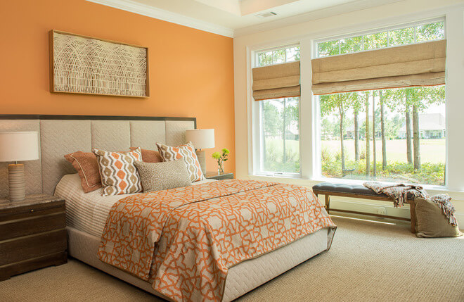 Rất nhiều các gia chủ đều lưỡng lự khi sử dụng những màu nổi bật, đậm cho phòng ngủ của mình. Nếu muốn có một không gian phòng ngủ với màu cam ấm, hãy thử nó trên một khoảng tường nhỏ, và sử dụng kết hợp với các màu nội thất trung tính khác, nó sẽ giúp cân bằng không gian phòng ngủ của gia đình bạn.